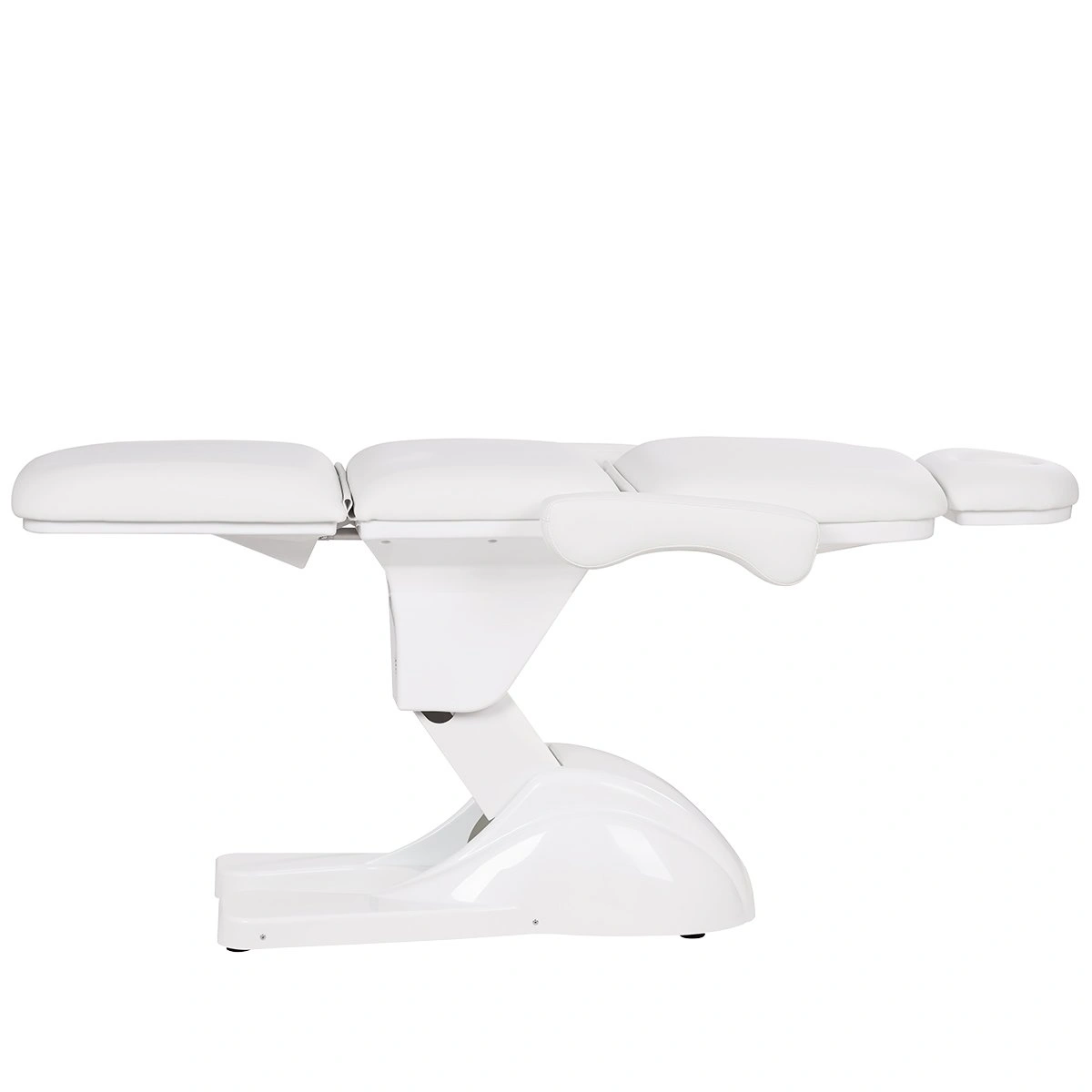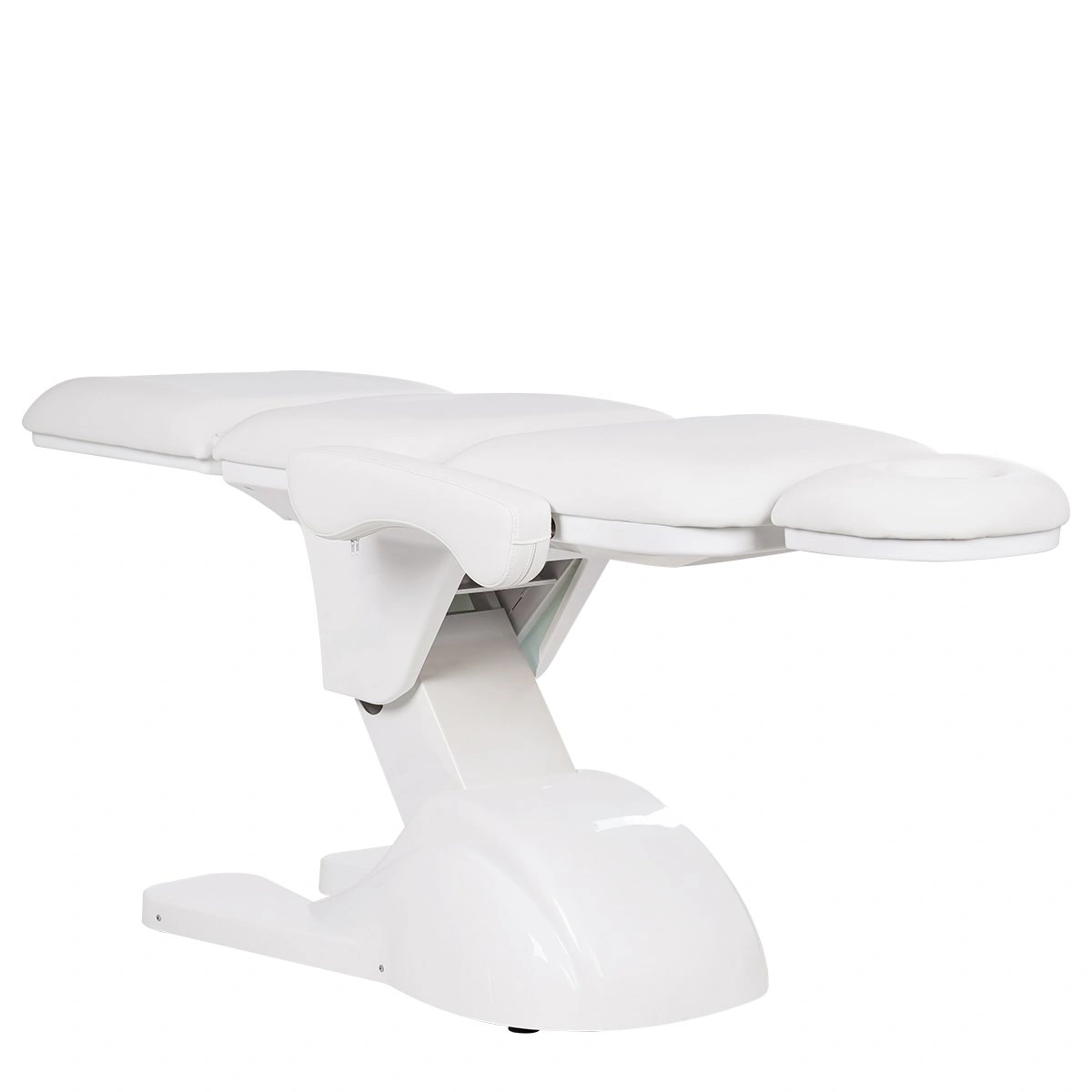 У кресла усиленный каркас из прочного металла с широким устойчивым основанием на подпятниках, конструкция полностью раскладывается в горизонтальное положение, имеются подголовник с отверстием для лица и съёмные регулируемые подлокотники. Модель можно использовать для различных процедур: косметология, наращивание ресниц, педикюр, оформление бровей и т.д.