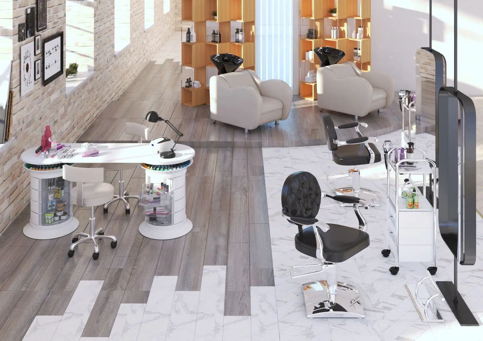 Большая столешница выполнена из прочной ЛДСП с защитной окантовкой. Данный материал хорошо моется и дезинфицируется, не портится из-за случайно пролитых косметических средств. Тумбы изготовлены из пластика с удароустойчивыми свойствами. Ящики вращаются вокруг стального каркаса. Металлические элементы надежно защищены от влияния коррозии порошковой краской.