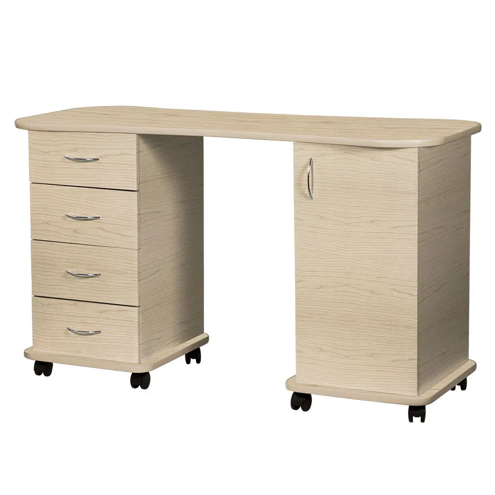 Если Вы желаете купить стильный и удобный стол для маникюра – Эсти-2 сможет полностью удовлетворить Ваши потребности. Он выполнен из качественной ламинированной ДСП, которая отличается высокой прочностью и долговечностью. Ламинированное покрытие легко очищается, не боится воздействия влаги и дезинфицирующих средств, а также длительное время сохраняет красивый внешний вид. Тумбы установлены на колеса, благодаря которым стол можно легко перемещать и поворачивать. В нашем магазине маникюрный стол Эсти-2 можно купить из наличия в цветах складкой программы (венге, венге/белый дуб), или под заказ, в любом другом цвете из каталога.