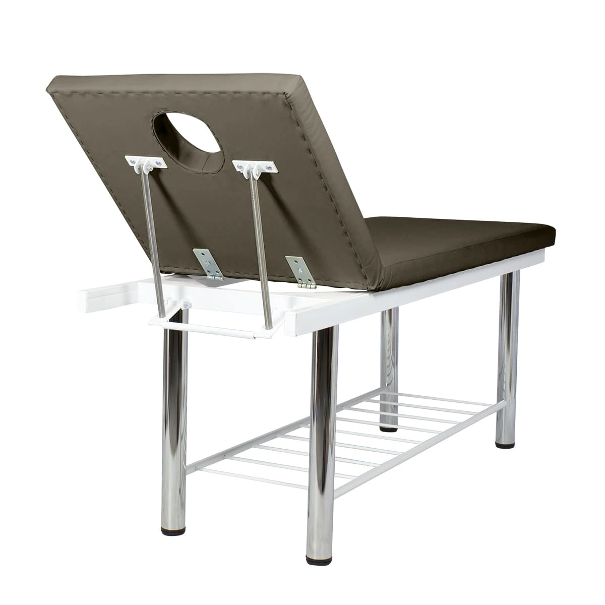 Комплектация: каркас из металла, ножки, мягкие детали (стол, подголовник с овальным вырезом, съемная подушка), усилитель каркаса в виде решетки.