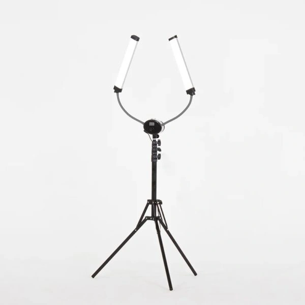 Конструкция лампы - два симметрично расположенных светильника на гнущейся основе. Компактная лампа позволяет настраивать оптимальный уровень света и фиксировать любой угол наклона. С помощью гибкого кронштейна можно снимать интересные видео процесса работы. Благодаря удобному штативу можно регулировать высоту лампы. Тренога легко собирается и разбирается. В комплекте есть практичная сумка, с помощью которой можно транспортировать и хранить оборудование.