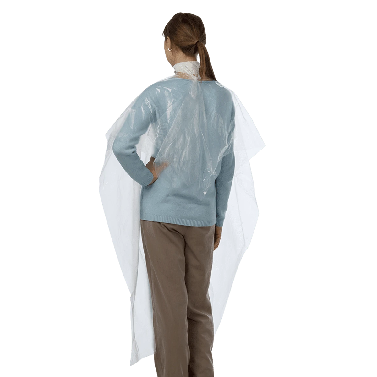 Данное изделие применяется при выполнении различных видов парикмахерских работ: стрижках, окрашиваниях и химической завивке волос. Также полиэтиленовые пеньюары могут использоваться визажистами и бровистами во время работы.
