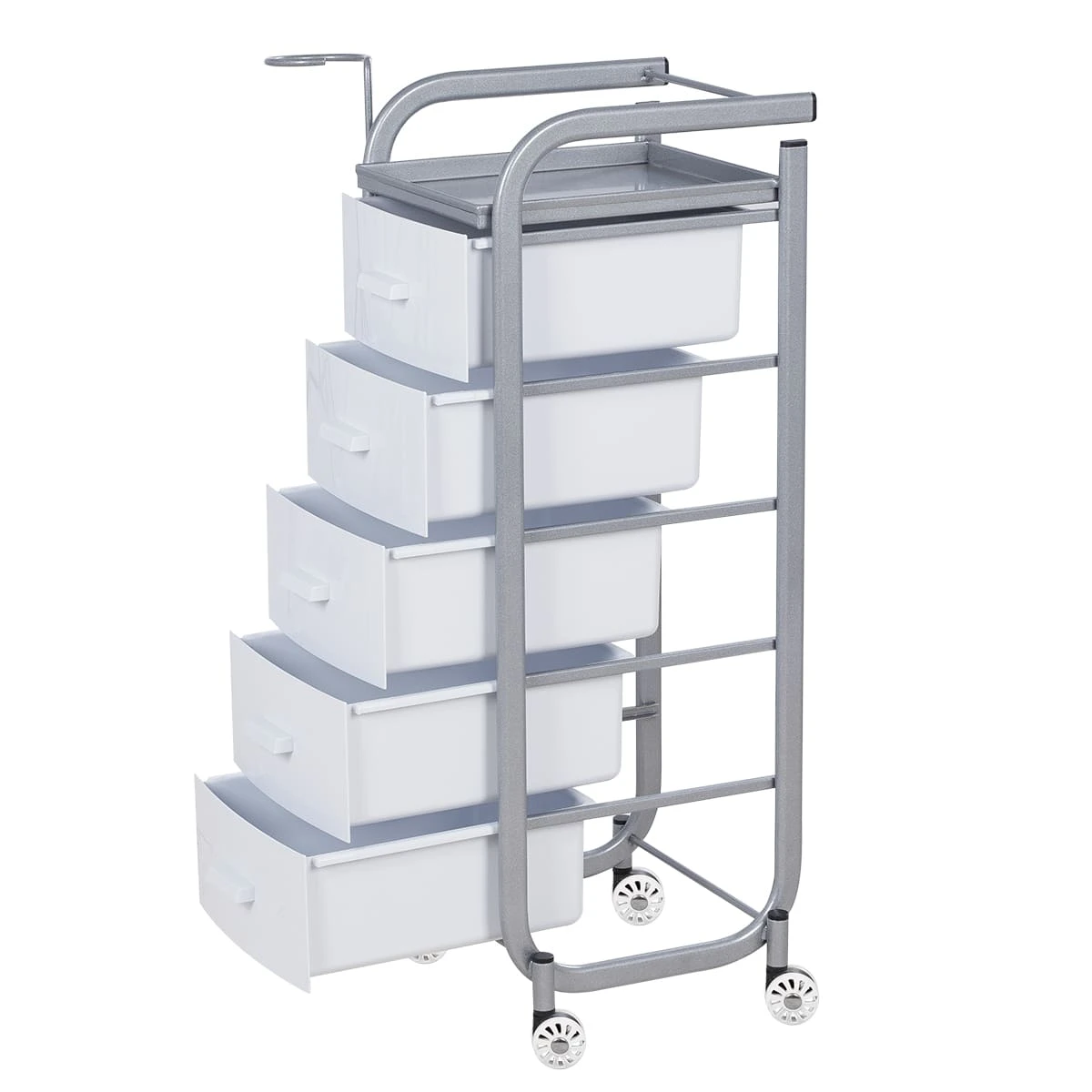 Для принадлежностей в парикмахерской тележке есть пять выдвижных закрытых ящиков, обеспечивающих защиту от влаги, пыли, волос и красящих элементов. Верхняя металлическая крышка — пространство для инструментов и баночек красоты, она позволит мастеру держать под рукой все необходимое во время работы с клиентом. Также модель оснащена фенодержателем.