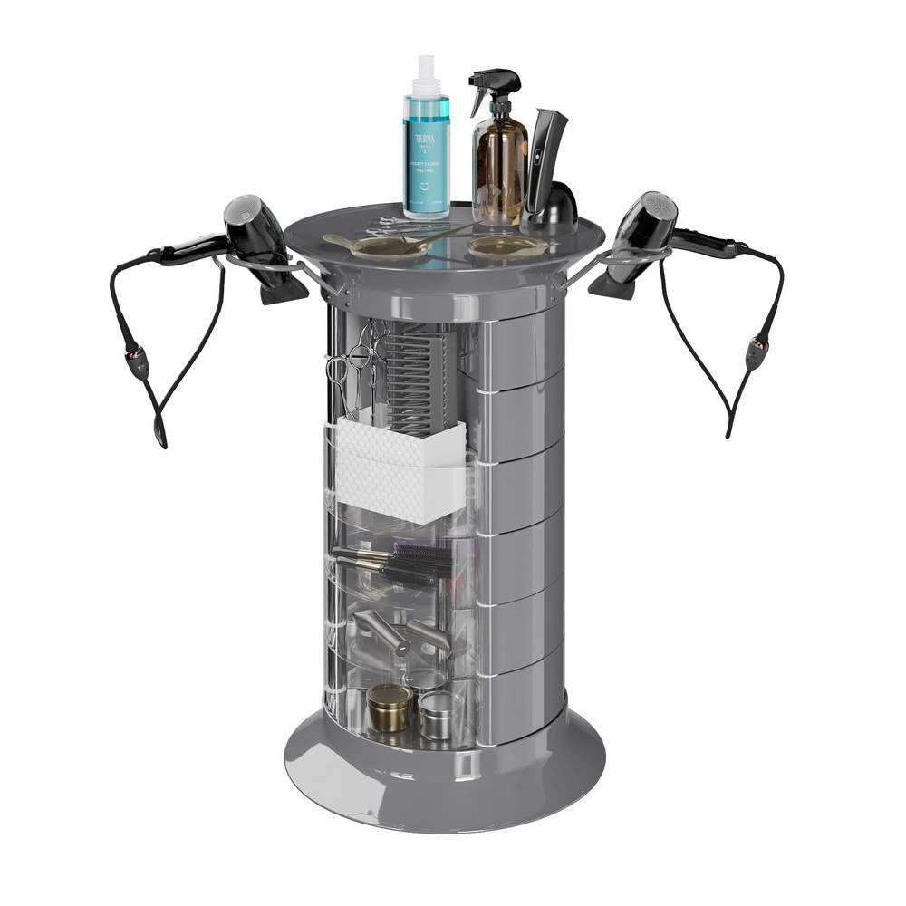 Продуманная конструкция позволит мастеру хранить все свои приспособления в одном месте. В распоряжении специалиста 16 раздвижных ящичков, которые поворачиваются вокруг стоек каркаса. Чтобы в тумбе можно было поставить высокие сосуды, с одной стороны отсутствует два ящика. Верхняя полка имеет специальные отверстия, предназначенные для емкостей и чаш. С двух сторон крышка оборудована держателями для фенов. Мобильность мебели обеспечивается шестью поворотными колесиками. Тележка может быть использована для обстановки двух рабочих мест.