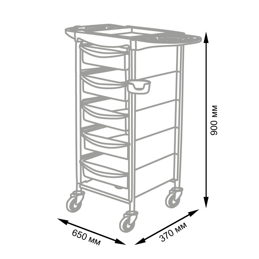 Комплектация: металлический каркас, 5 вместительных ящиков, боковины, верхняя крышка с боковыми полками, съемный пластиковый фенодержатель, колеса.