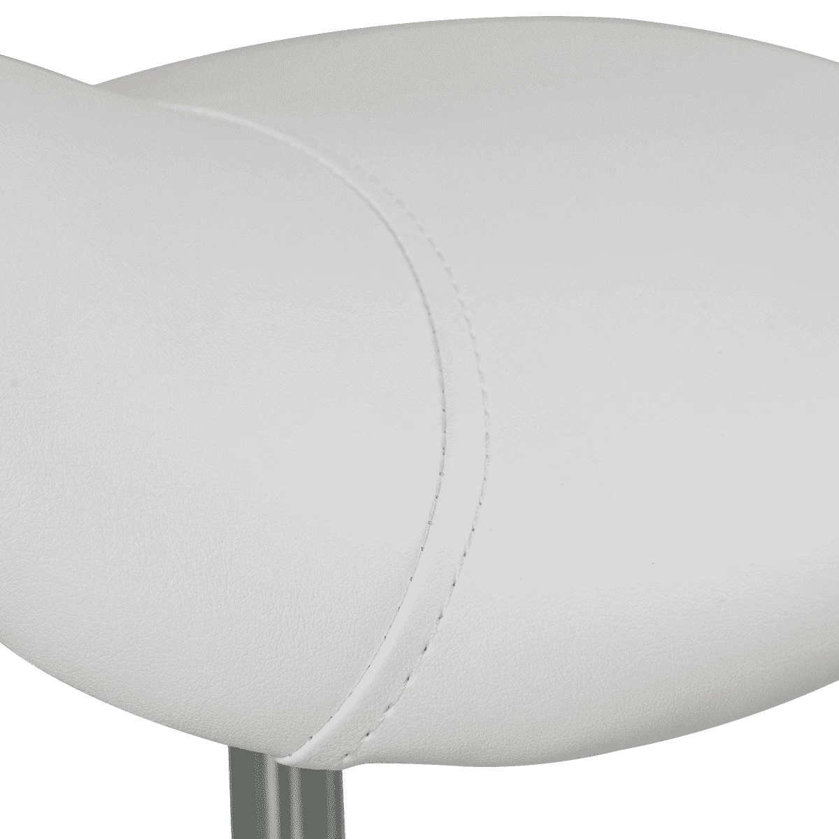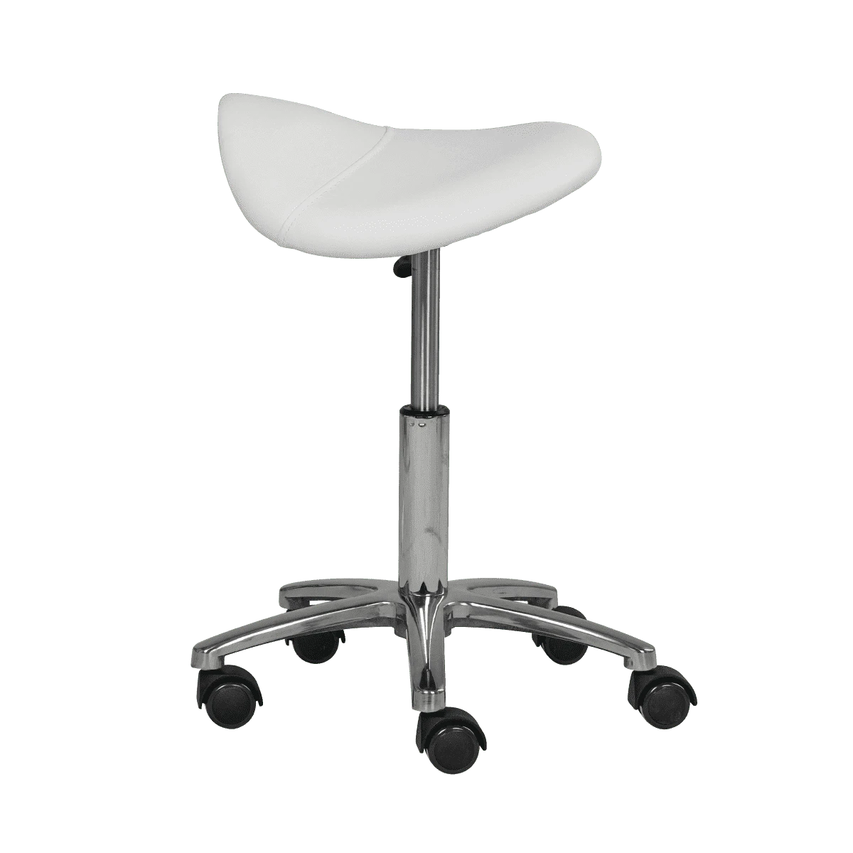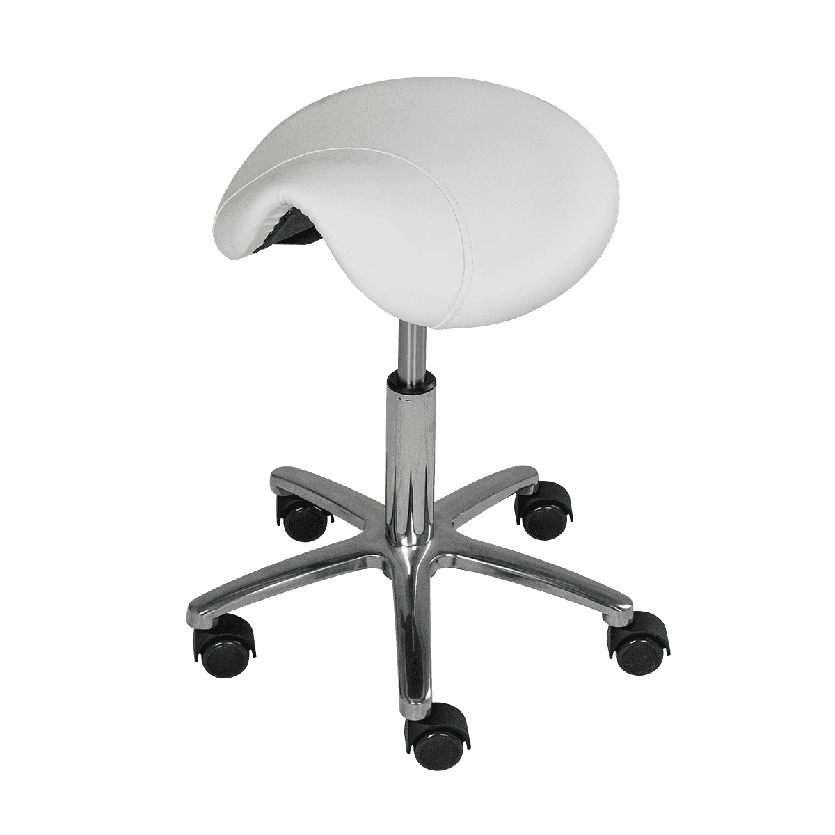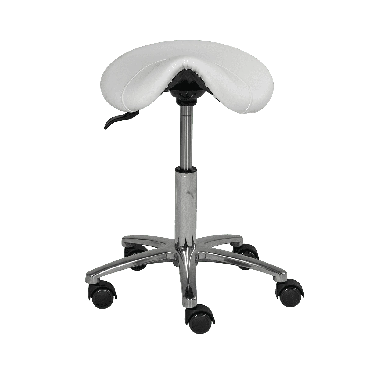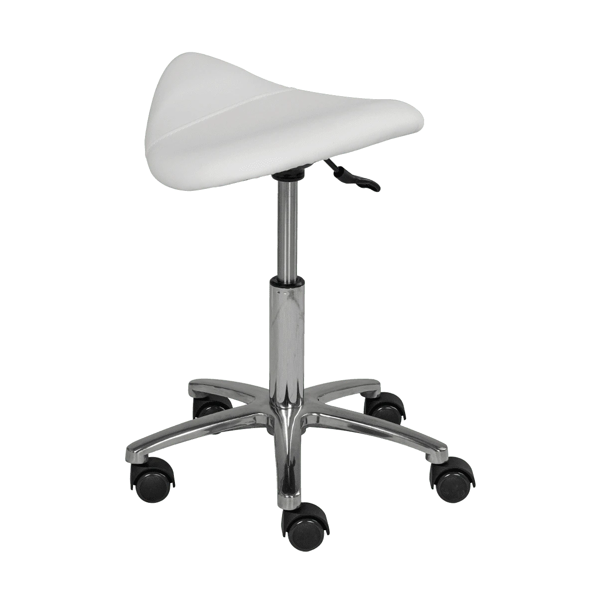 Стулья данной конфигурации, с сиденьем в форме седла, пользуются популярностью среди профессионалов. Такой стул позволяет снизить утомляемость и предотвращает появление болей в спине и ногах на протяжении и после рабочего дня. Неоспоримым преимуществом модели является наличие удобной опоры для ног. Она, как и основание, выполнена из хромированного металла. Без усилий перемещать стул по помещению позволяют легко вращающиеся колеса из прочного черного пластика. Они также обеспечивают устойчивость стула на полу с любой поверхностью.
