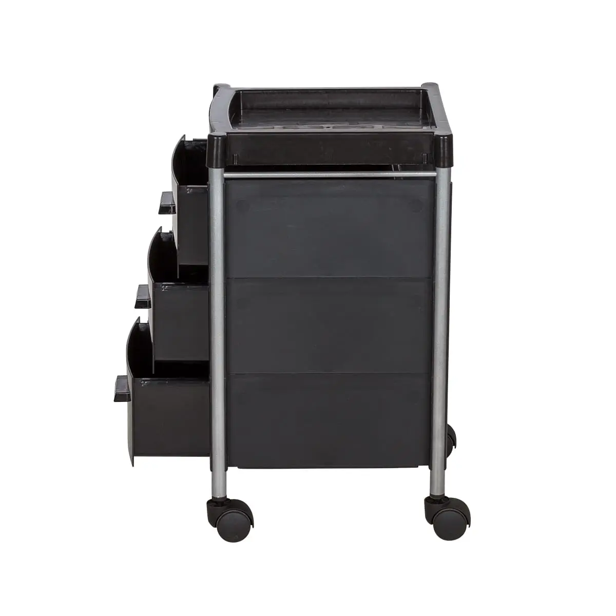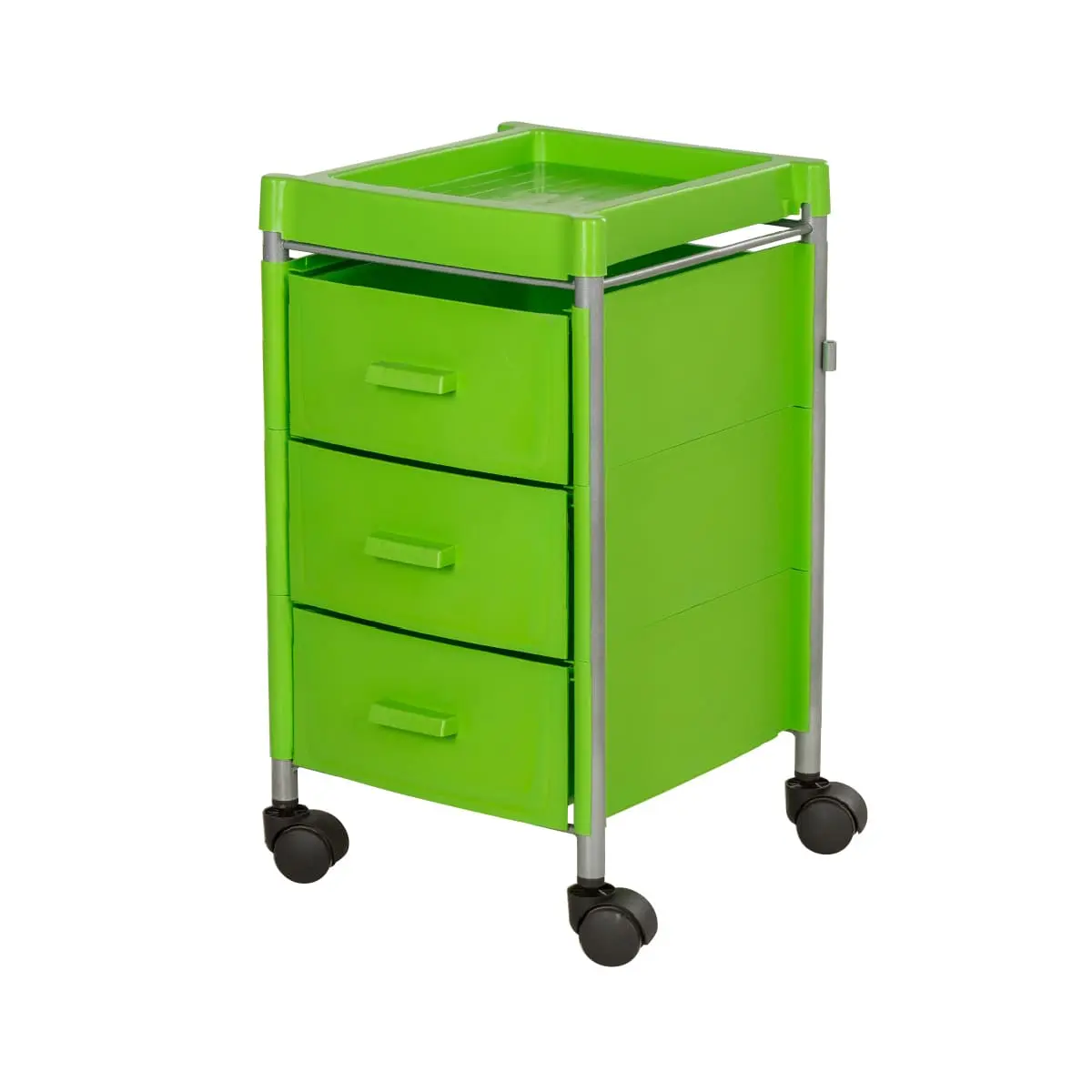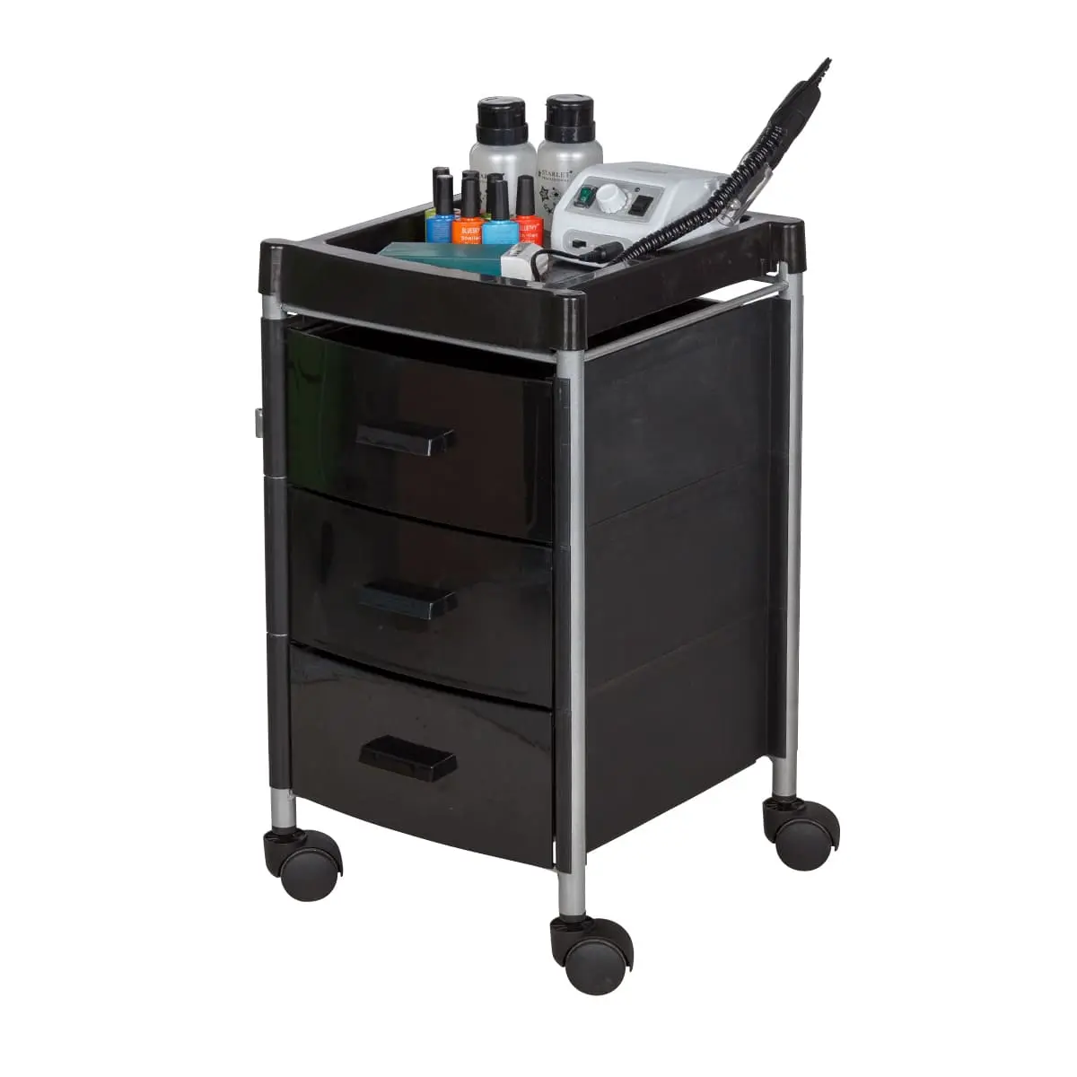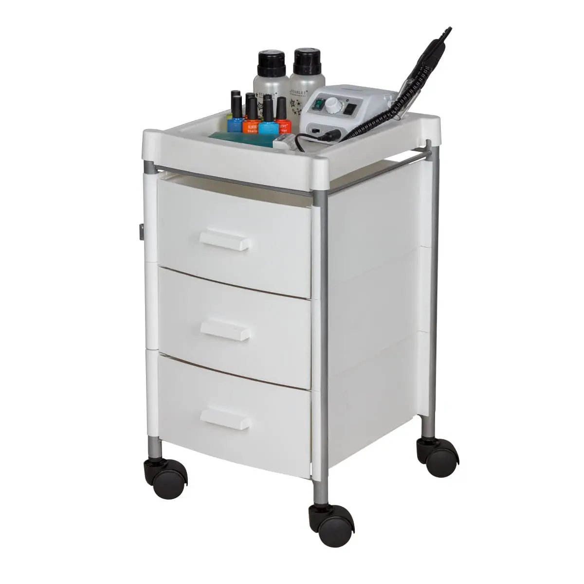 Три ящика вместят все инструменты и расходные материалы, создав порядок на рабочем месте. Верхняя полка имеет отверстия разных диаметров. Здесь мастер может расставить инструменты, необходимые во время проведения процедур. Корпус установлен на поворотные колеса, что обеспечивает плавное и быстрое перемещение тележки по салону.