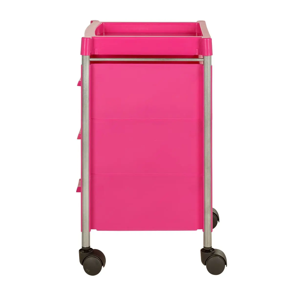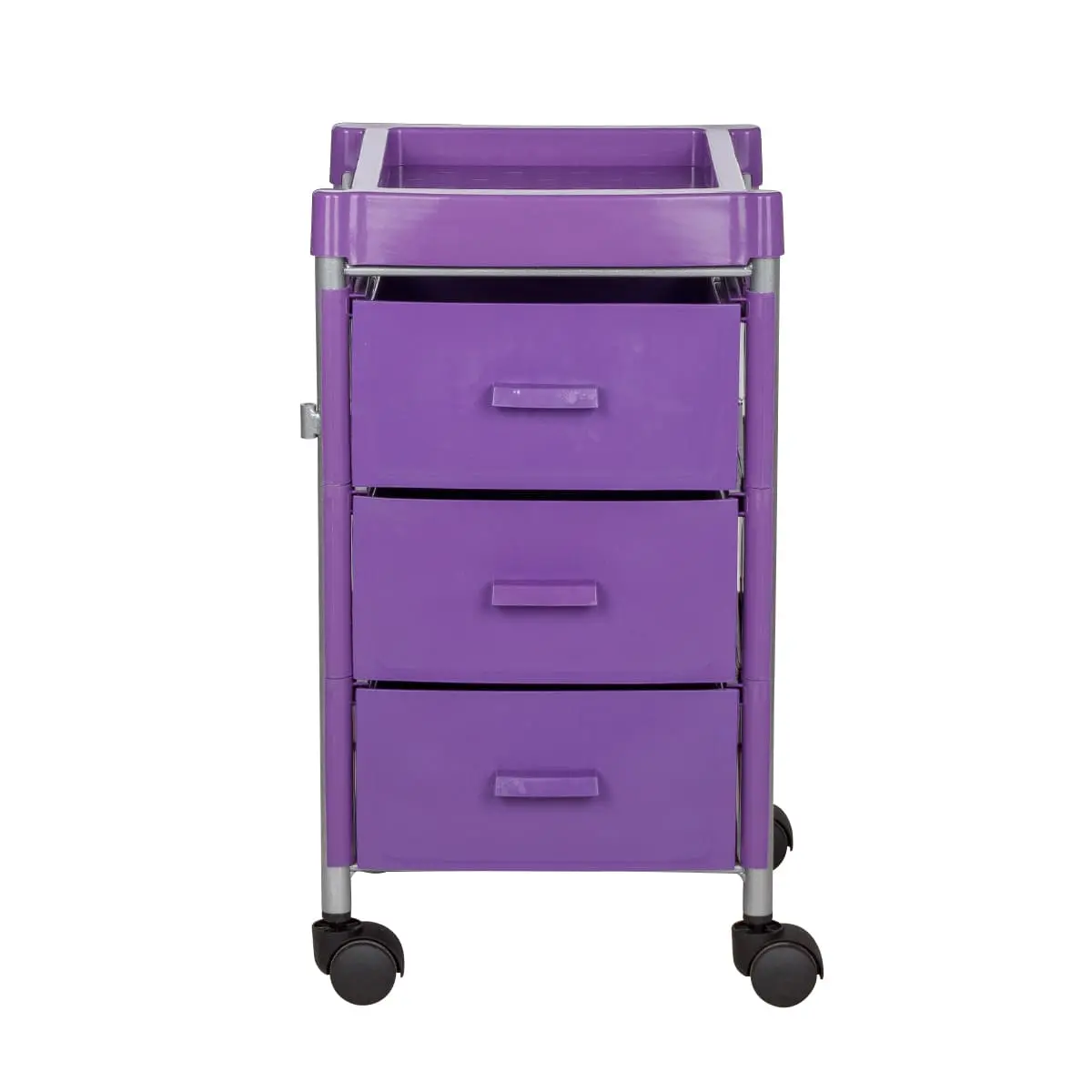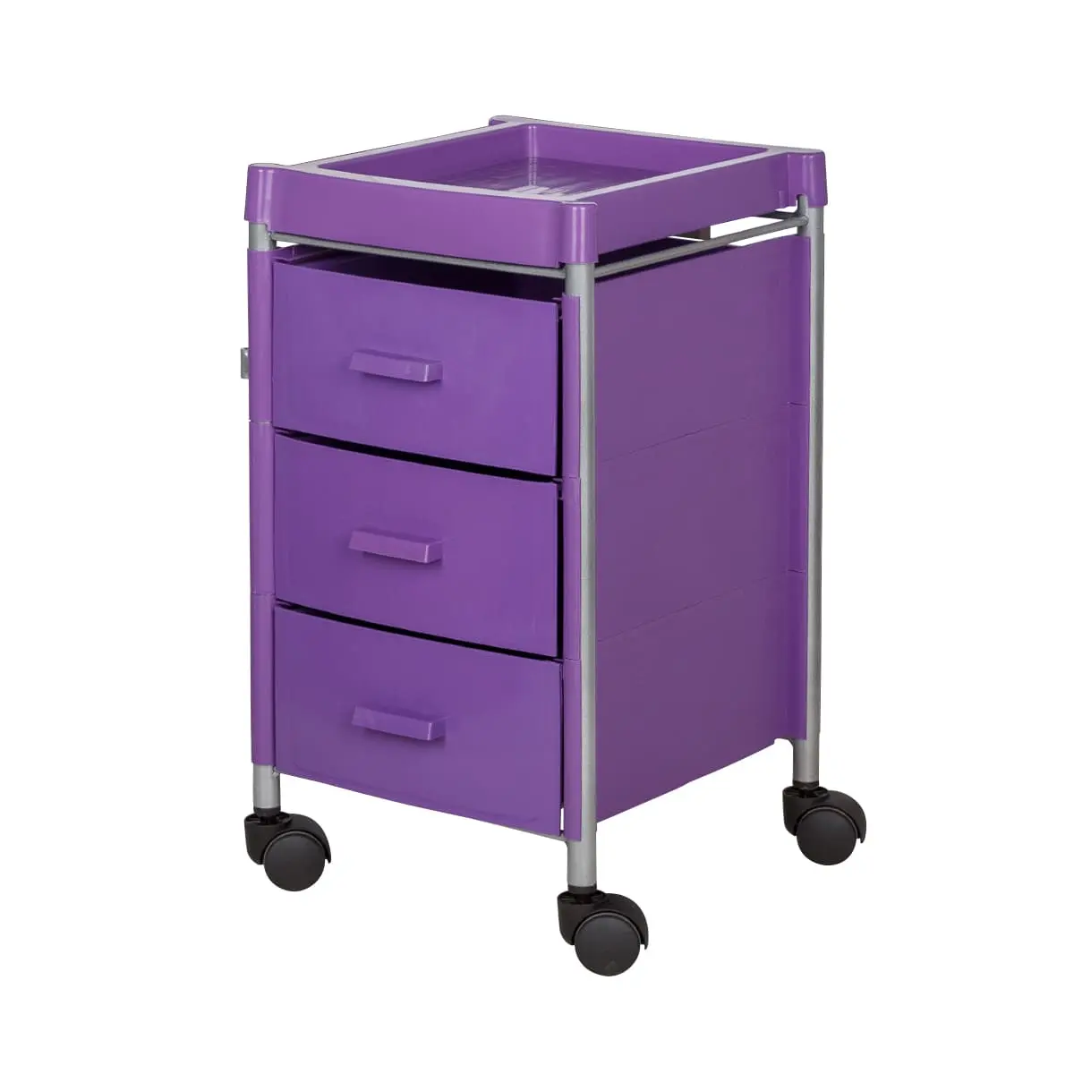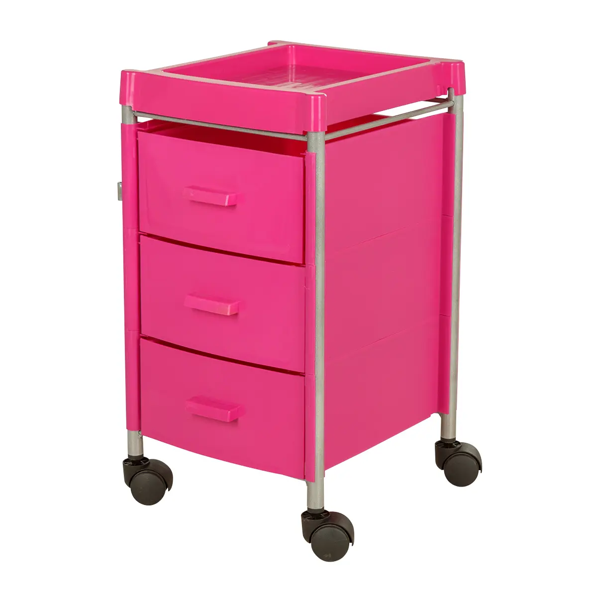 Три ящика вместят все инструменты и расходные материалы, создав порядок на рабочем месте. Верхняя полка имеет отверстия разных диаметров. Здесь мастер может расставить инструменты, необходимые во время проведения процедур. Корпус установлен на поворотные колеса, что обеспечивает плавное и быстрое перемещение тележки по салону.