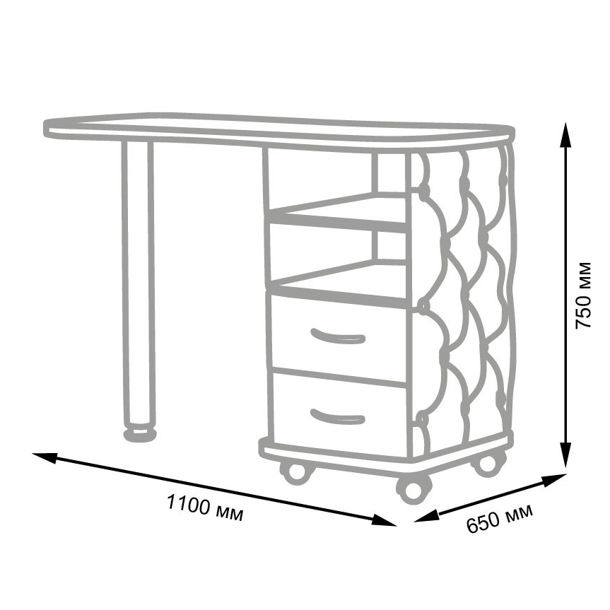 Комплектация: столешница, тумба, выдвигающиеся ящики, полка, стальная ножка.