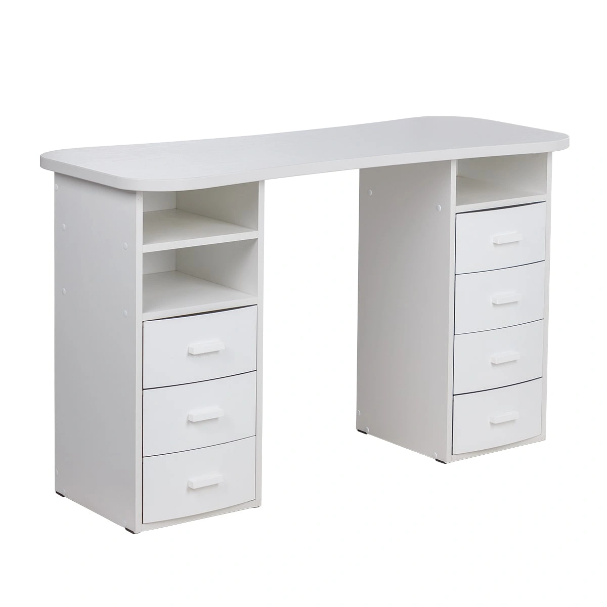 Маникюрный стол Элвуд оборудован столешницей с плавными изгибами, благодаря чему открывается легкий доступ к рукам клиента. На широких краях достаточно места, чтобы поставить маникюрные аппараты и расходные материалы. Под столешницей есть две удобные тумбы с ящиками и открытыми полками для всех приспособлений мастера.