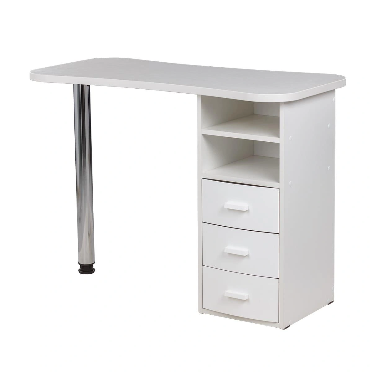 Маникюрный стол Марион-3 имеет столешницу удобной изогнутой формы, что позволяет расставить необходимые инструменты и аппараты, а также обеспечивает доступ к рукам клиента. Секция хранения – тумба с тремя ящиками и двумя открытыми полками, в которых достаточно места для приспособлений мастера. Маникюрный стол выполнен из прочной ЛДСП устойчивой к воздействию влаги. Края окантованы специальной ПВХ кромкой. Ножка изготовлена из хромированной стали и установлена на подпятник из резины. Ящики из прочного пластика хорошо моются, не деформируются после дезинфекции или случайно пролитых косметических средств.
